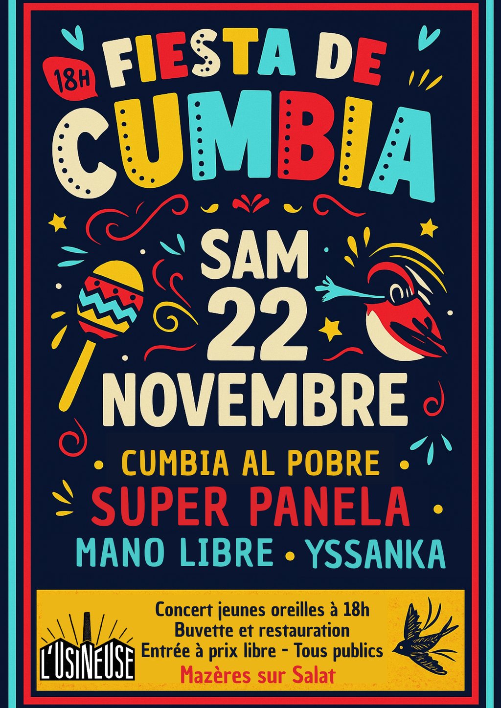 🕕 18h – Cumbia al Pobre : concert jeune public, plus doux et plus tôt, pour danser en famille ou entre amis.